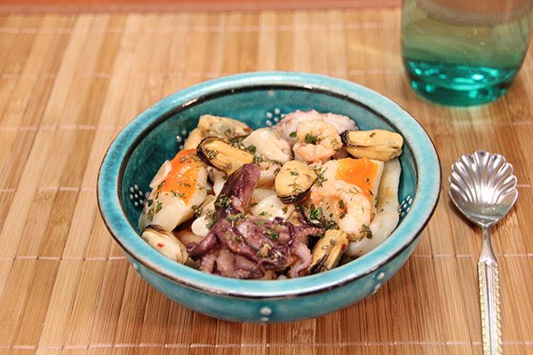(Tintenfischringe; Minioctopus; Garnelen; Muschelfleisch; Surimi Flakes (Krebsfleischimitat)) veredelt mit Kräutern und Knoblauch